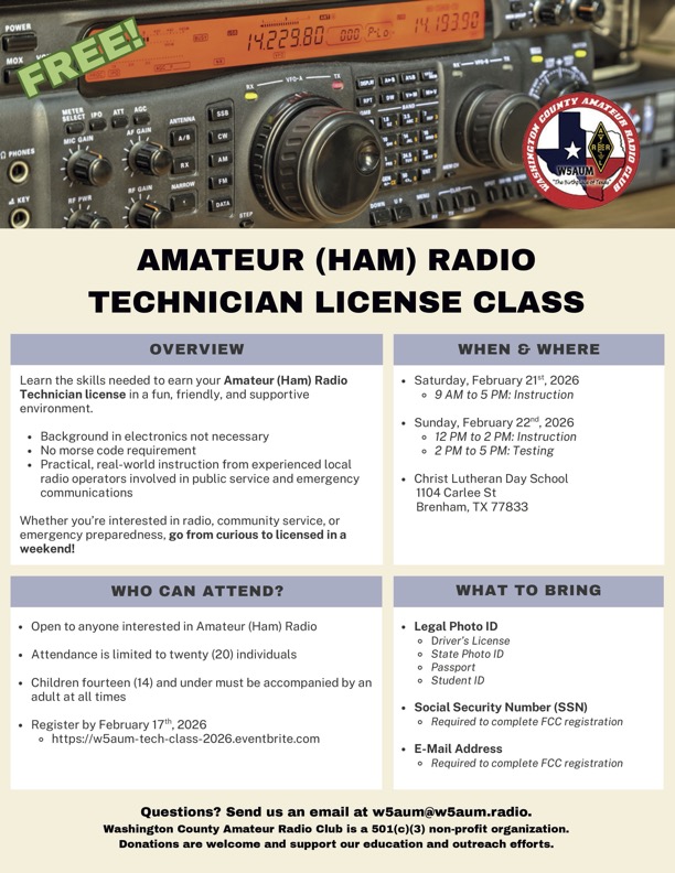 The Washington County Amateur Radio Club (W5AUM) is proud to announce the successful completion of its February 2026 Amateur (Ham) Radio Technician License Class. The two-day course, held February 21–22, 2026, introduced participants to the fundamentals of amateur radio, including basic electronics, radio operating practices, safety, and the many ways amateur radio operators serve their communities. Designed to take participants from curious beginners to licensed operators in a single weekend, the class provided practical, real-world instruction from experienced local radio operators involved in public service and emergency communications.